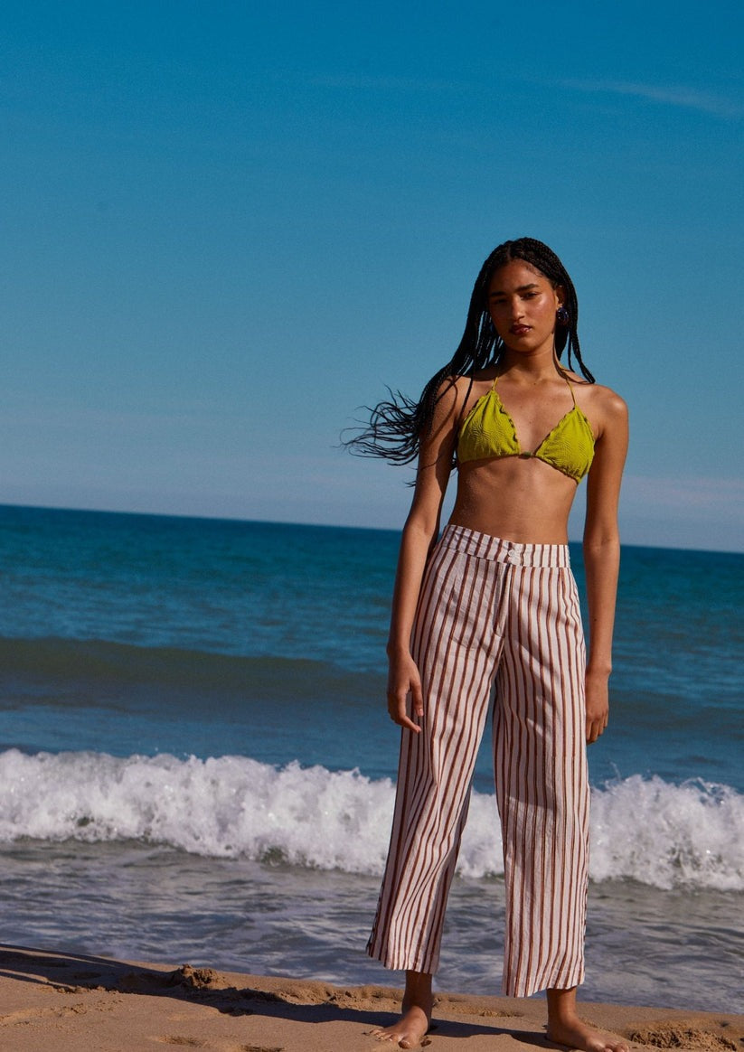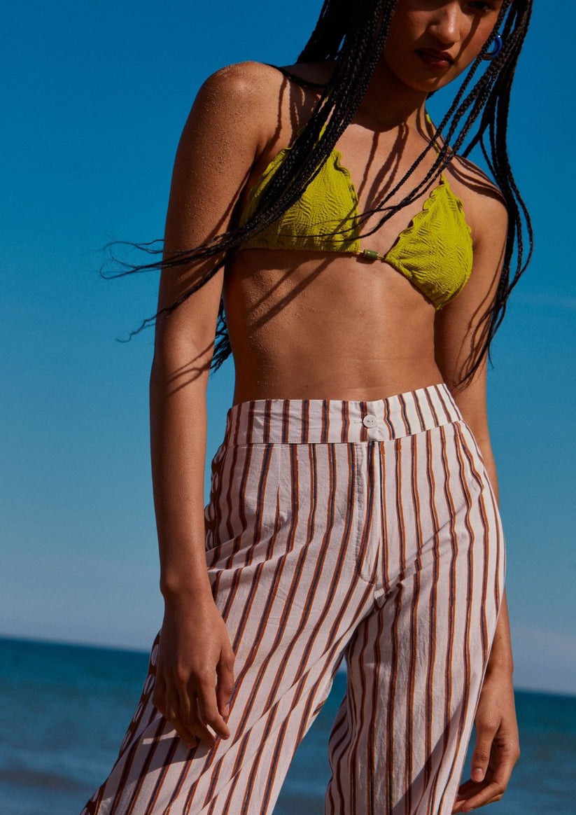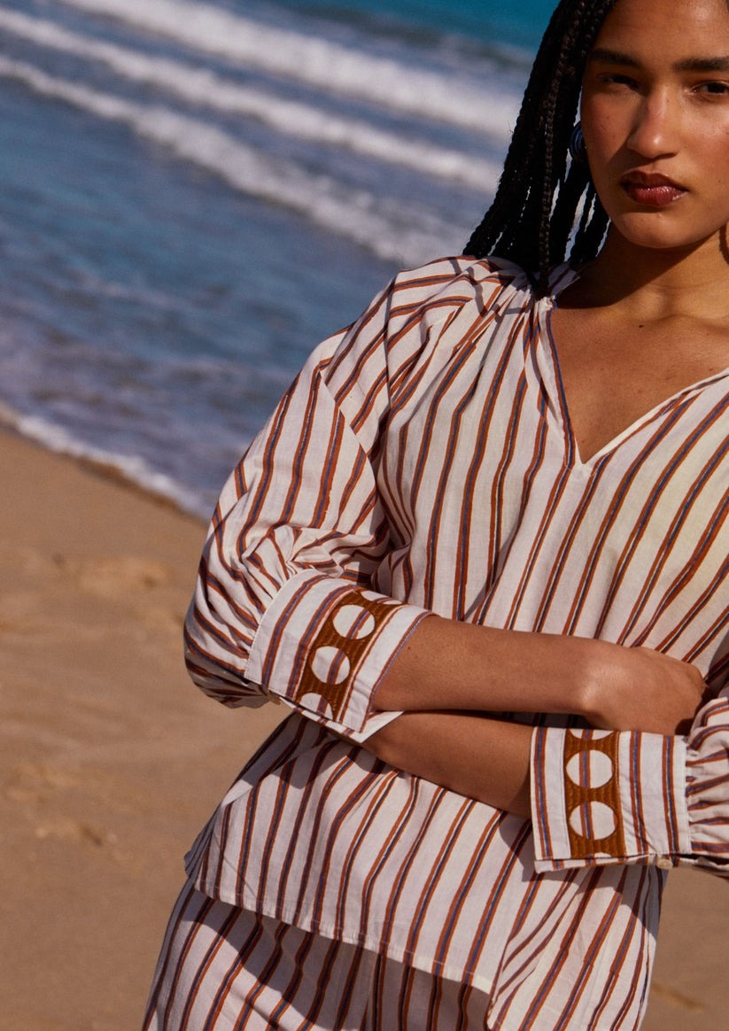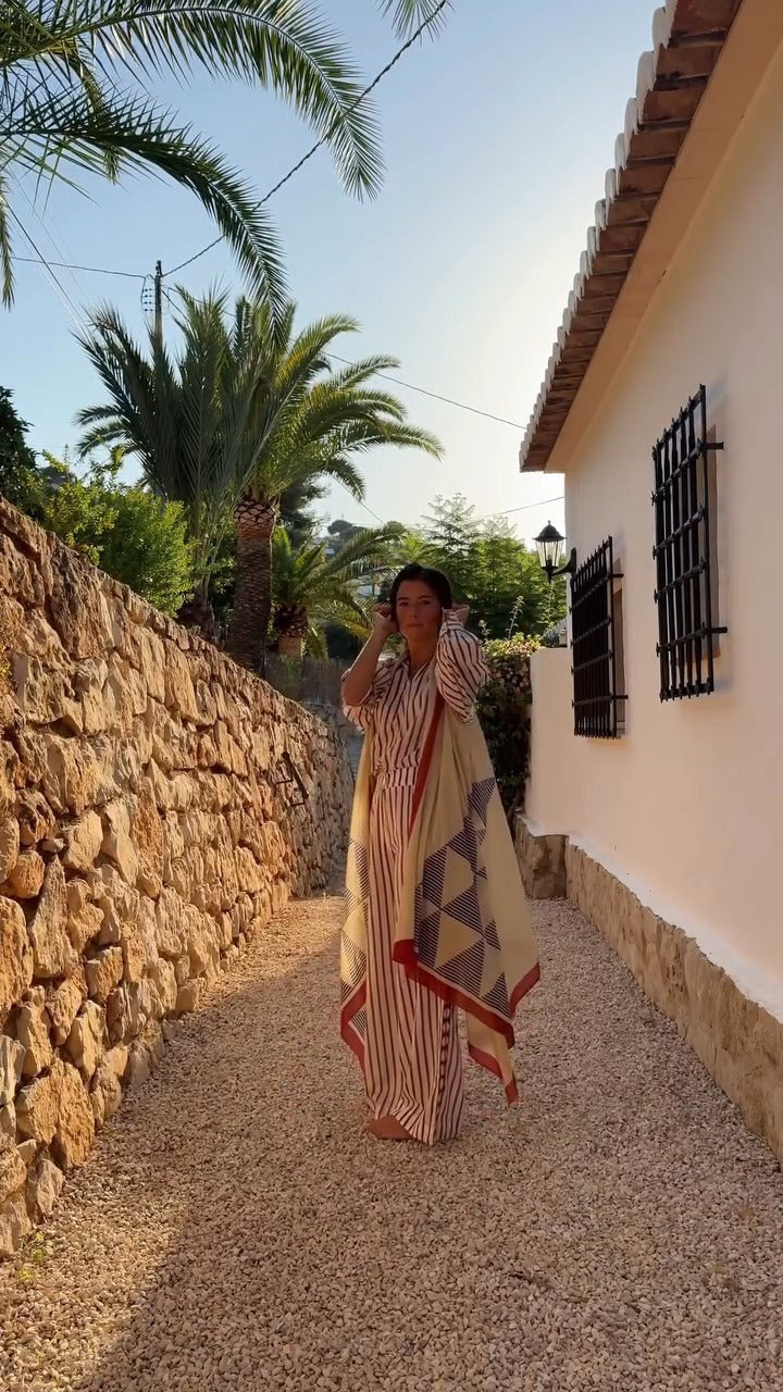 Made from 100% cotton voile using block printing techniques and natural dyes, it is lightweight and breathable. Ideal for sunny days or relaxing afternoons by the sea.