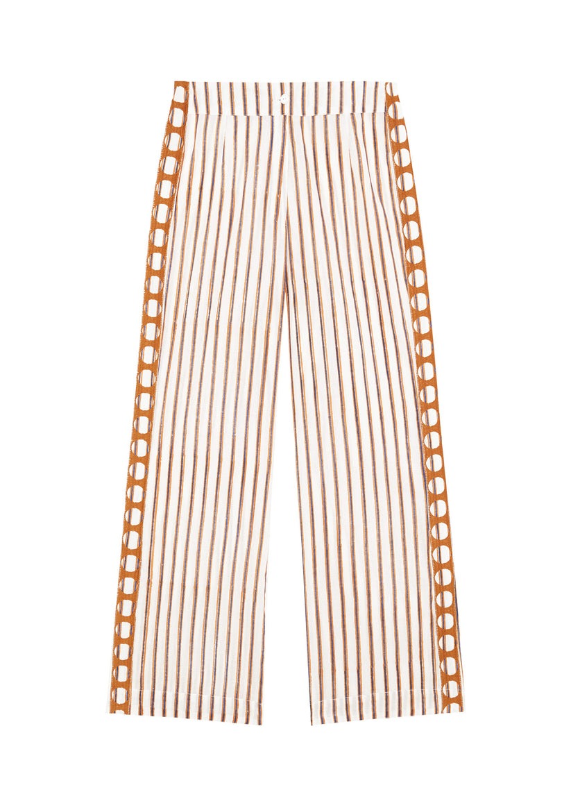 Mediterranean-inspired ensemble featuring a mandarin collar blouse, flowing trousers, and an open kaftan, all in a blue and brown striped print.