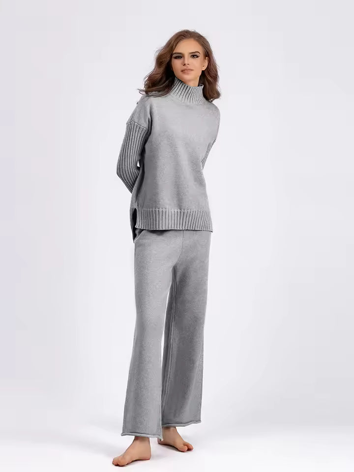 Nuestro popular conjunto de punto grueso combina calidez ligera con un estilo minimalista perfecto para el invierno. Su cuello vuelto, el ajuste suelto y el pantalón ancho crean un look cómodo.
