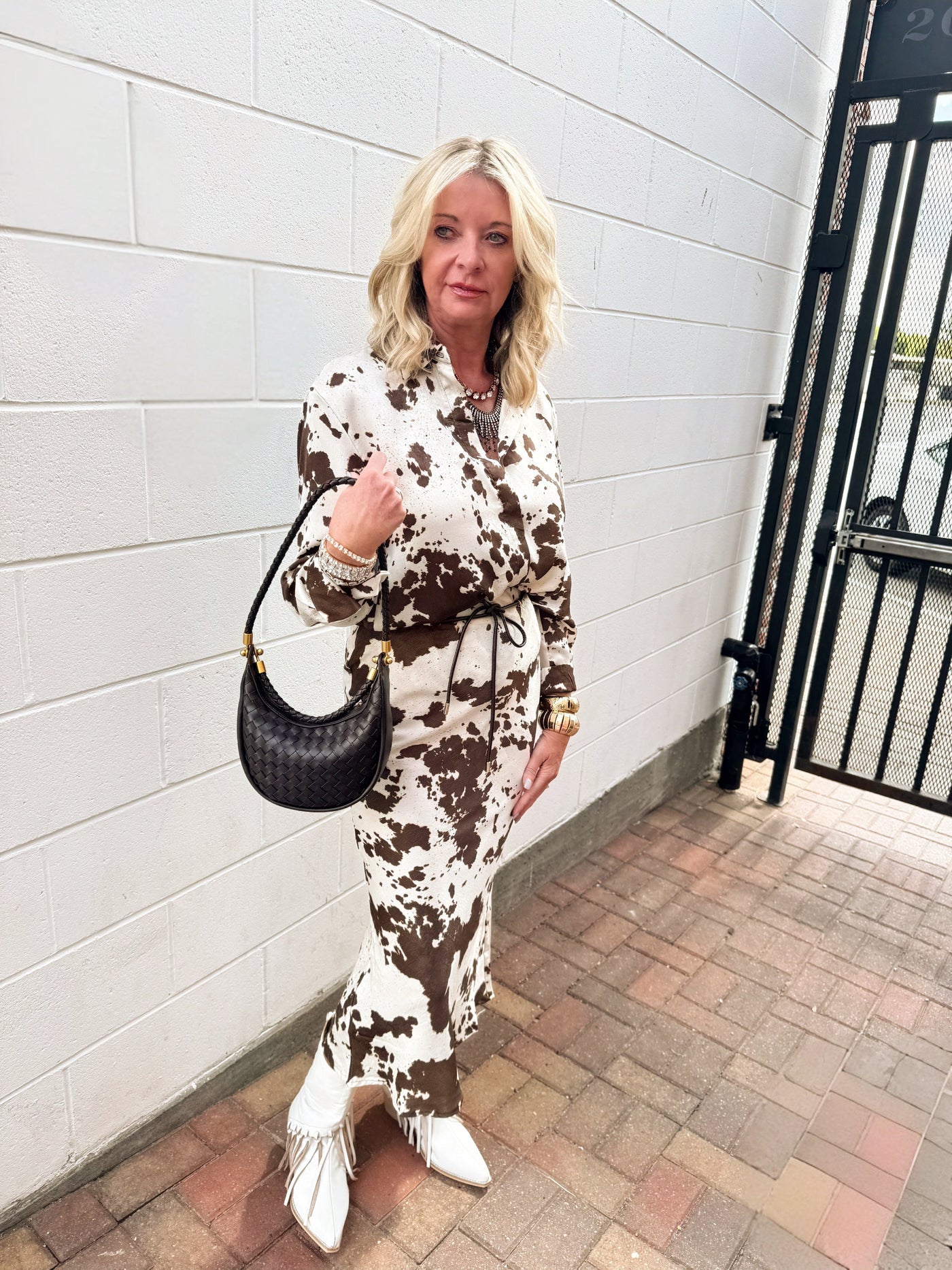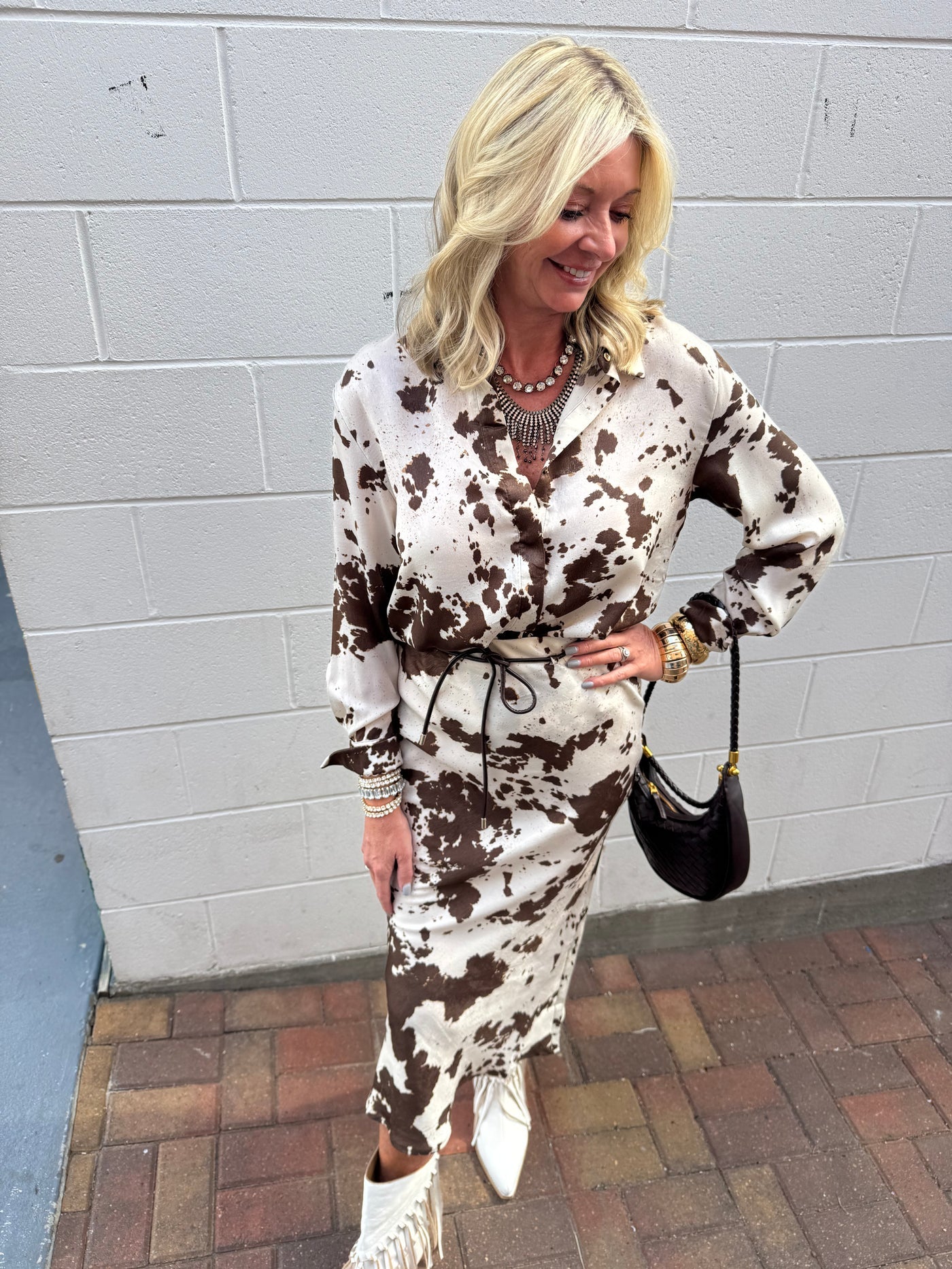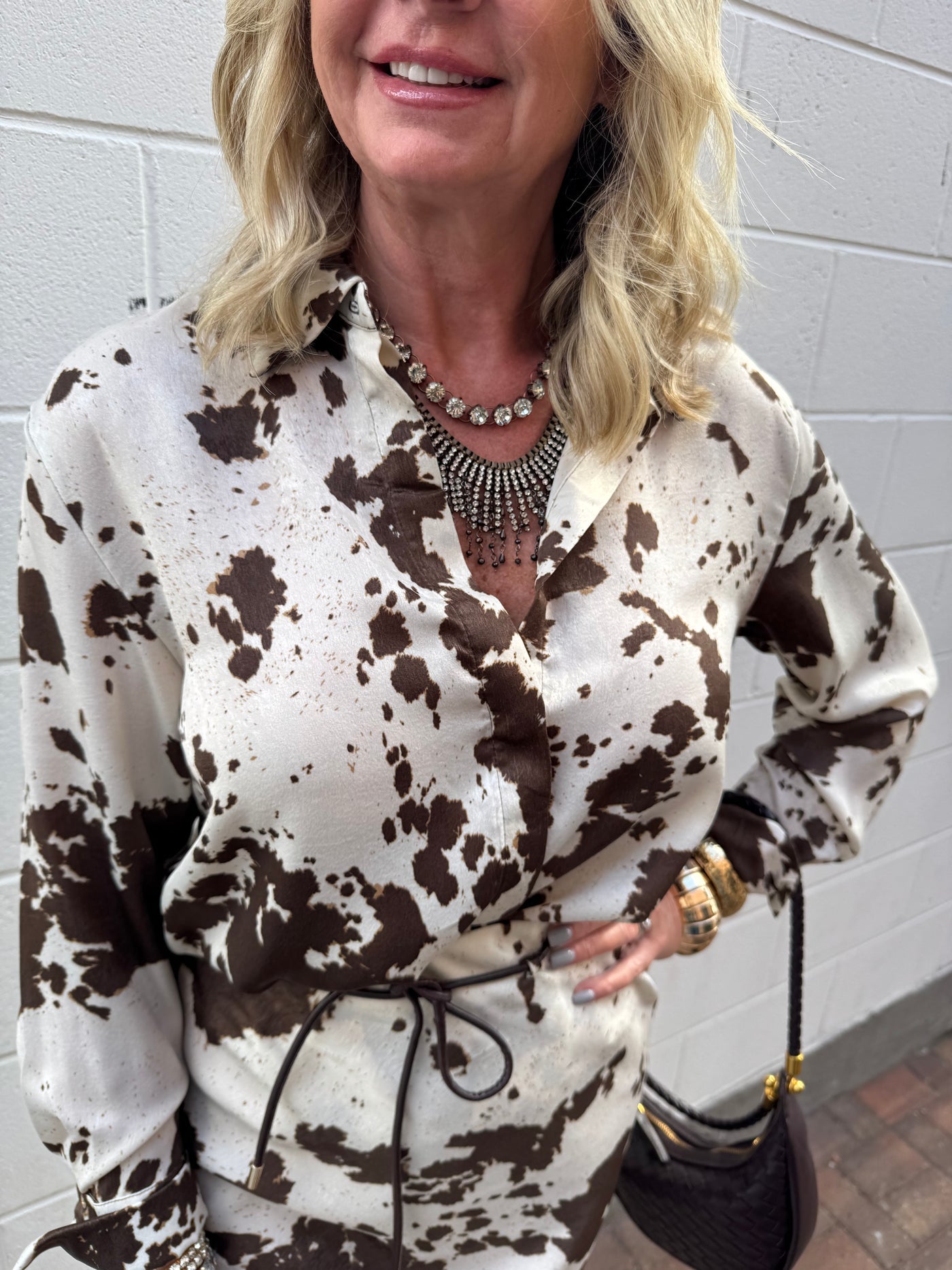 Nuestro popular conjunto satinado cow print aporta una elegancia moderna con un toque western discreto. Su tejido ligero y caída suave estilizan sin esfuerzo, creando un look femenino y cómodo sin exagerar.