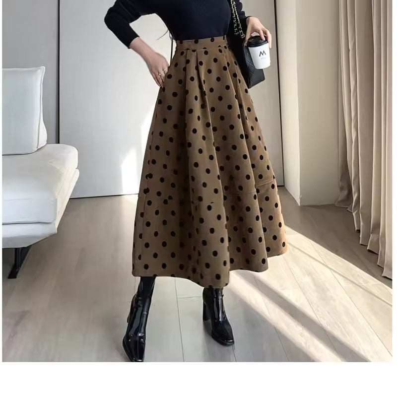 Nuestra popular falda de pana combina un estilo retro con un diseño cómodo y femenino ideal para el otoño. Su textura gruesa y los lunares sutiles aportan un toque distinguido sin exagerar.