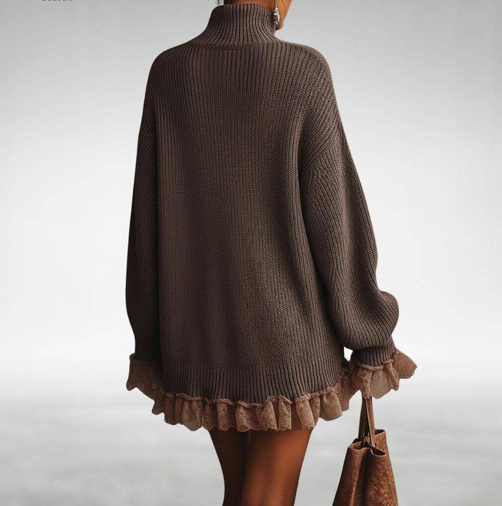 Nuestro popular jersey-vestido combina punto cálido con un diseño femenino y delicado. Su ajuste amplio y el detalle de volantes crean un look acogedor y elegante sin exagerar, perfecto para sentirte cómoda.